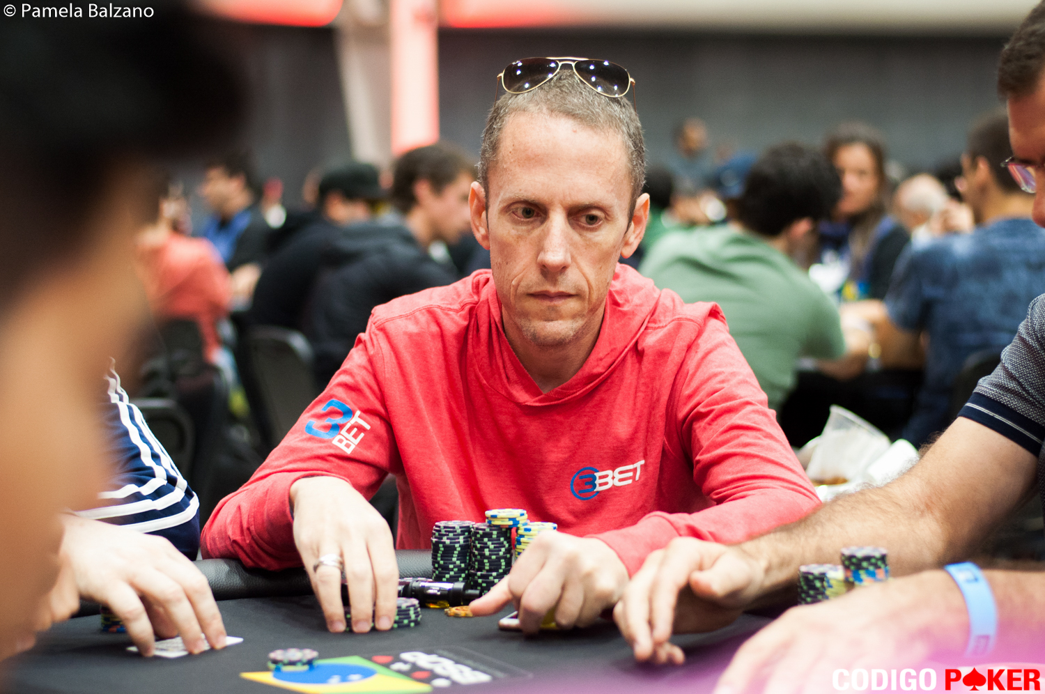 Arribamos a la mesa televisada para ver cómo desde UTG, Mario López abrió a 9.000 puntos que Steitson Fraiha 3beteó a 22.000 en HJ. Desde BU, Pedro Padilha no quiso ser menos por lo que subió a 38.500, y cuando la pelota volvió para Mario, 5beteó a 78.000. El turno le llegó nuevamente a Fraiha que mandó sus 197.000 fichas para hacer foldear a Padilha y a López después de preguntar cuántos puntos tenía su oponente.