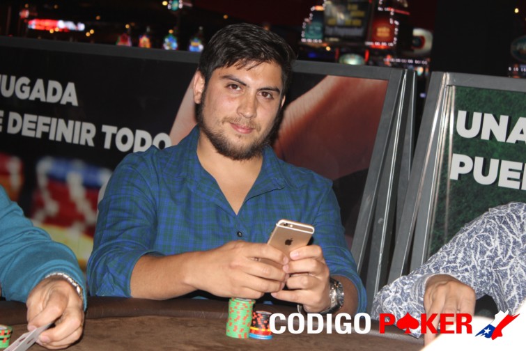 Carlos Zapata, luego de haber tirado cuatro veces all ins seguidos, hizo lo mismo en modo ciego por 24.000 y en el botón Cristian Aceitón le pagó con Q8 mientras que el talquino llevaba 104. En el board apareció una reina y con esto Aceitón aumentó su stack a 100.000.