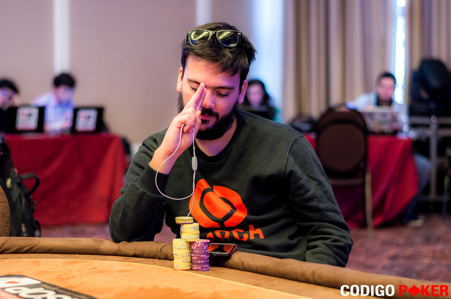 Desde CO Fernando Mateus anunció all in por 65.000 puntos, en la SB Jorge Dominguez anunció all in arriba y se vieron las cartas.