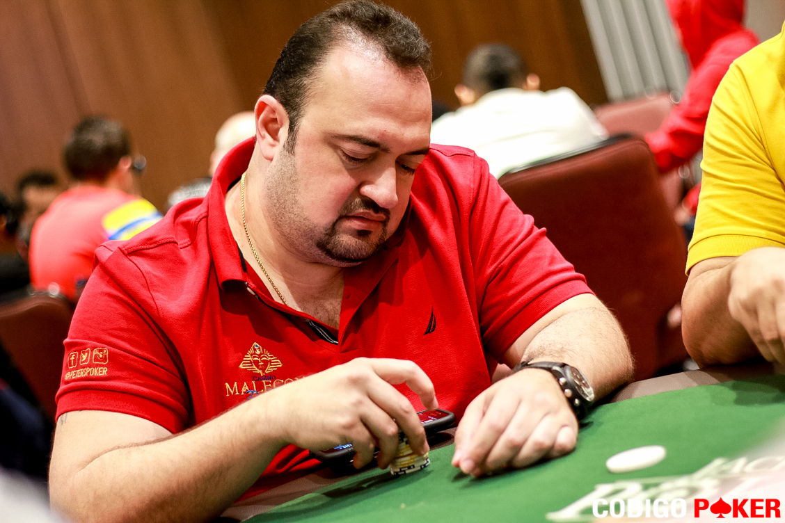 El flop trajo: A 9 4 y ante el check del colombiano, Yoel continuó con 8.000 puntos. Al ver que sus rivales tiraron sus naipes a la baraja Palmar enseñó A 7 exclamando: «¡Qué tristeza!»