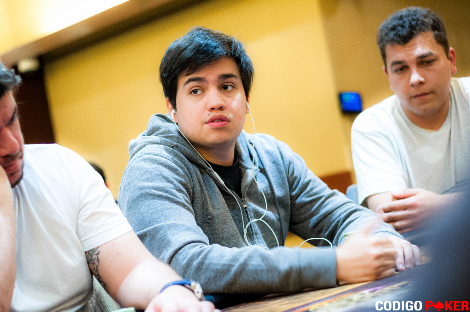 La acción comenzó con el limp de un jugador en UTG+1, seguido por el de otro en MP, desde el botón Fabián Castro roleó a 2.200 y en la ciega chica Maximiliano Veyga se jugó por 7.500 totales, igualados solamente por UTG+1.