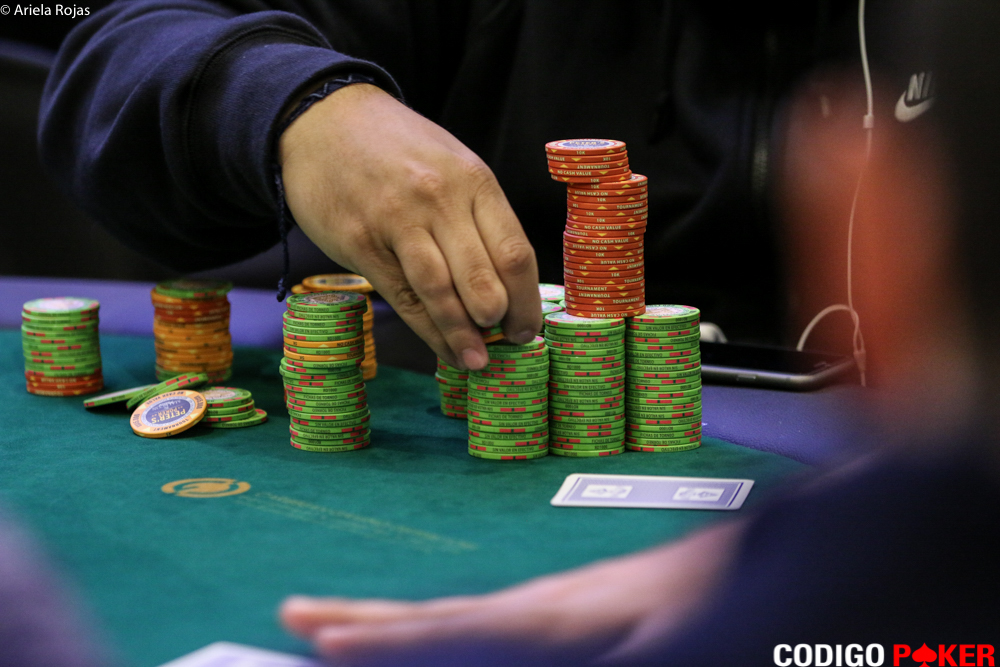 Ubicado en SB, y con todos los jugadores retirándose hasta ese momento, Julián Velásquez pagó plano, pero a su izquierda, Esteban Rivera mandó su resto que su oponente igualó. Entonces: