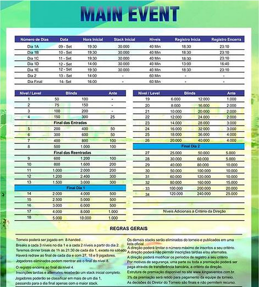 donde podrán comenzar a entrar en clima de competencia. El buy-in del Evento Principal será de R$1.300 con una bolsa de R$1.500.000 garantizados e incluirá cinco Dias 1, con la posibilidad de hacer un re-entry hasta el octavo nivel y registro tardío hasta el cuarto.